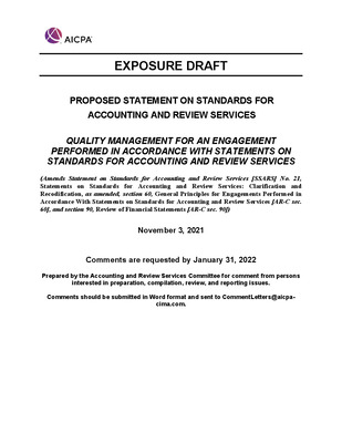 Proposed Statement on Standards for Accounting and Review Services, Quality Management for an Engagement Performed in Accordance with Statements on standards for Accounting and Review Services; Exposure draft (American Institute of Certified Public Accountants), 2021, November 3