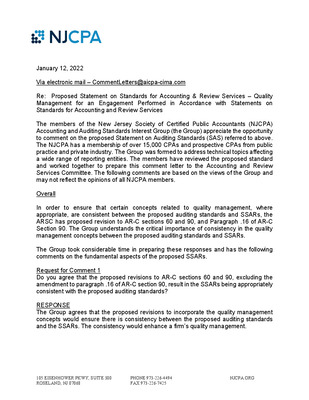Comment letters on Proposed Statement on Standards for Accounting and Review Services, Quality Management for an Engagement Performed in Accordance with Statements on standards for Accounting and Review Services, November 3, 2021