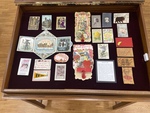 Many of the items in this case belong to the Ann Rayburn Collection of Paper Americana. Ann Rayburn was an antique dealer and avid collector of postcards. The mail pieces on display are characteristic of American cultural heritage during the late nineteenth and early twentieth centuries, some containing idioms of the day. In addition to the customary paper, these postcards feature more unconventional materials, specifically velvet, felt, leather, feathers, and glass. Some postcards have mechanical elements, such as tabs, pulls, and rotating volvelles.