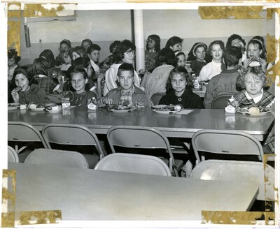 Elementary school students eating at long tables with metal folding chairs. Paper milk cartons. 1960. Date is estimated.