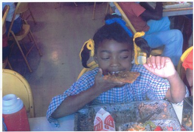 Color photo of young girl eating what appears to be pizza. 1975. Date is estimated.