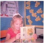 Young girl with “Skipping breakfast is for the birds” poster behind her. 1970.