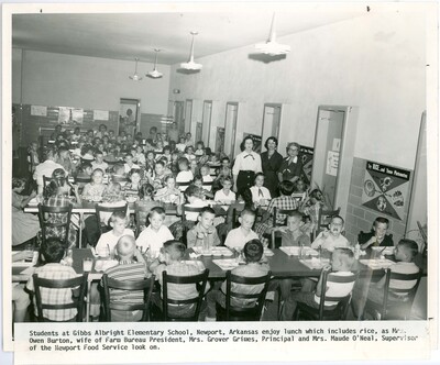Students at Gibbs Albright Elementary School, Newport, Arkansas, which includes rice, as Mrs. Owen Burton, wife of Farm Bureau President, Mrs. Grover Grimes, Principal, and Mrs. Maude O’Neal, Supervisor of the Newport Food Service look on. 1950. Date is estimated.