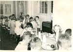 Cafeteria full of elementary students eating lunch with glass milk bottles. 1957. Date is estimated.