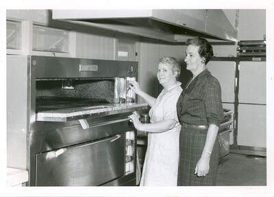 Two unidentified women standing in front of an oven. 1970. Date is estimated.