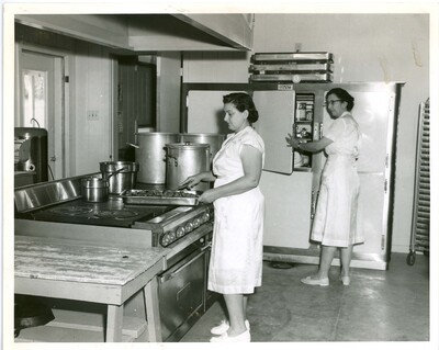 Two unidentified female cafeteria workers. 1960. Date is estimated.
