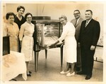 Oven demonstration scene with Miss Ruth Powell standing on left. 1958. Date is estimated.
