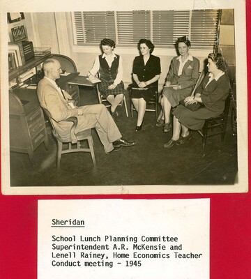 School Lunch Planning Committee, Superintendent A. R. McKensie and Lenell Rainey, Home Economics Teacher, conduct meeting – 1945.