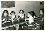 Five young girls eating at a long table and drinking from glass bottles. 1950. Date is estimated.