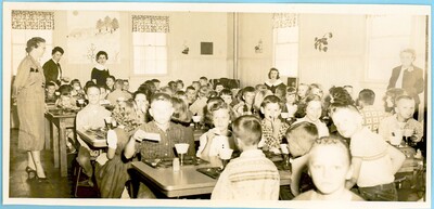 Large group of elementary age children and five adult females in a packed cafeteria. 1945. Date is estimated.