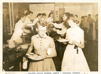 Sylvan Hills School Lunch - Pulaski County. Students passing through the lunch line with five adult females serving their plates. 1950. Date is estimated.
