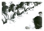 Young students with lunch plates and glass bottles of milk. 1950. Date is estimated.