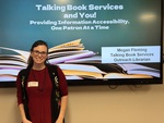 Megan Fleming stands in front of the title slide to her presentation, Talking Book Services and You: Providing Information Accessibility, One Patron at a Time