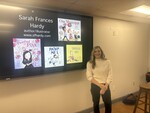 Author/Illustrator Sarah Frances Hardy stands in front of the title slide for her presentation.