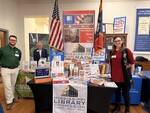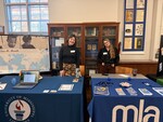 Abbie Norris-Davidson (left), Digital Initiatives Librarian and Associate Professor, stands with a display about Dear Mr. Meredith, a digital humanities project available in UM's institutional repository. Ashley Dees (right), Associate Head of Research and Instruction Services and Associate Professor, stands with an information table for the Mississippi Library Association, of which she is Past President.