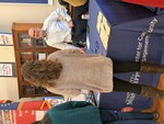 Wendy Daughdrill (Oxford Instermediate School) `stands by a display of Magnolia Book Award winners, wearing a festive sweater with a shiny gold reindeer. The text reads "fab-yule-ous".