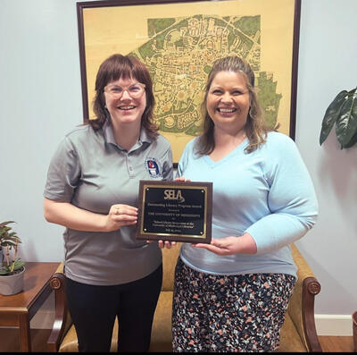 Elizabeth Batte and Melissa Dennis pose with the award for "Outstanding Library Program" presented by the Southeastern Library Association in 2024.