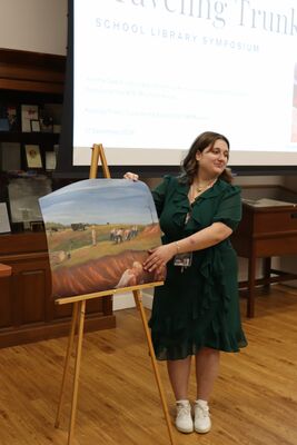 Kassidy Franz stands at an easel with a poster print of a painting by M. B. Mayfield during her presentation with Jeannie Speck Latartara, "M.B. Mayfield Traveling Trunk at UM Museum"