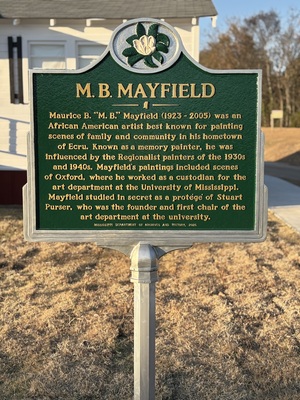 Maurice B. "M. B." Mayfield (1923-2005) was an African American artist best known for painting scenes of family and community in his hometown of Ecru. Known as a memory painter, he was influenced by the Regionalist painters of the 1930s and 1940s. Mayfield's paintings included scenes of Oxford, where he worked as a custodian for the art department at the University of Mississippi. Mayfield studied in secret as a protégé of Stuart Purser, who was the founder and first chair of the art department at the university.