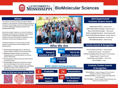 Our mission is to drive innovation through combined excellence in the disciplines of Pharmacognosy, Medicinal Chemistry, Pharmacology, and Environmental Toxicology in order to understand and improve human and environmental health. We provide positive impacts to our school, the state of Mississippi, and the world, via education and mentored research at the undergraduate, graduate, and postdoctoral levels, and through our leadership in interdisciplinary chemical and biological sciences.