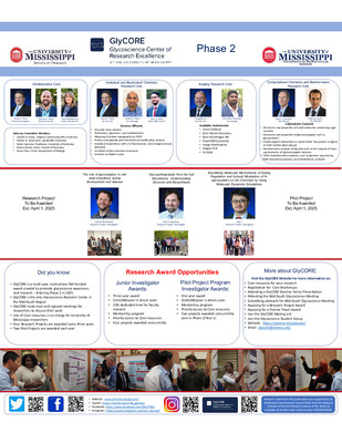 Poster outlines the four cores of the Glycoscience Center of Research Excellence at the University of Mississippi: administrative, analytical and biophysical research, imaging researching, computational chemistry and bioinformatics research. Research award opportunities are also outlined.