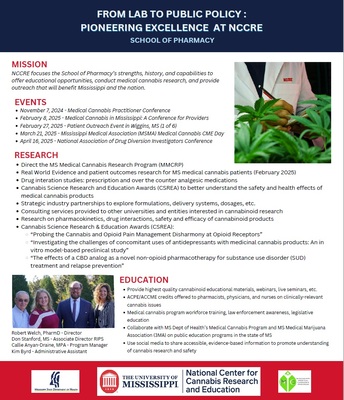 The National Center for Cannabis Research and Education (NCCRE) focuses the School of Pharmacy’s strengths, history, and capabilities to offer educational opportunities, conduct medical cannabis research, and provide outreach that will benefit Mississippi and the nation.